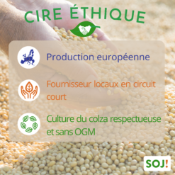 Notre cire de colza est produite à partir de l’huile de colza, obtenue en pressant à froid les graines de colza. Notre cire de colza provient exclusivement de sources européennes et est garantie sans OGM. Cela signifie qu’elle est non seulement respectueuse de l’environnement, mais qu’elle est également produite selon des normes éthiques et durables.